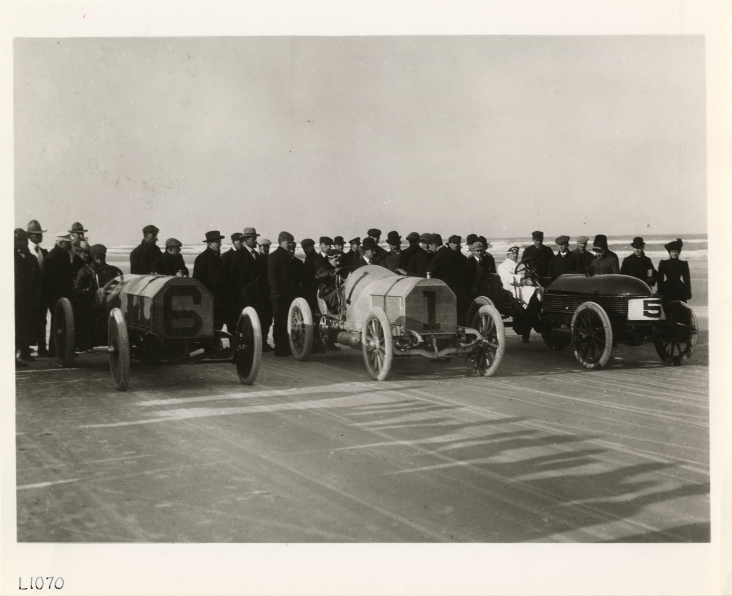 View of drivers in racecars at Ormond-Daytona Beach; spectators stand behind cars. Handwritten on back: "Race courses. Ormond-Daytona."