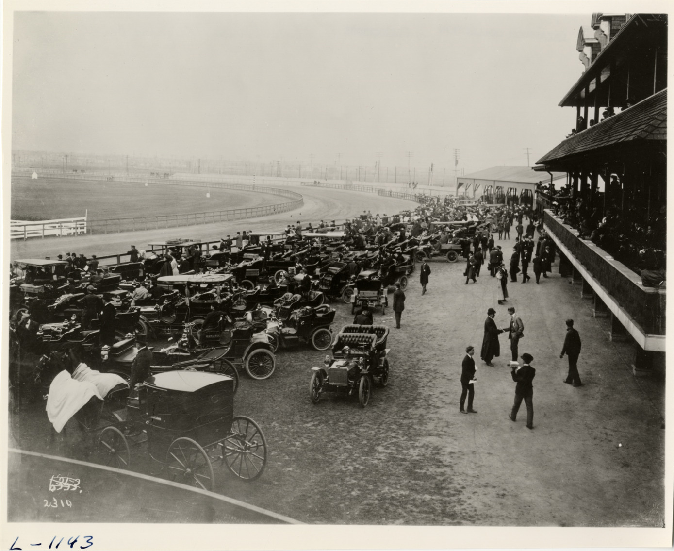 View of spectators with automobiles at Brighton Beach racetrack. Grandstand on right; horse-drawn carriage in foreground. Handwritten on back: "Race courses--Brighton Beach. Automobile race fans at Brighton Beach, N.Y."