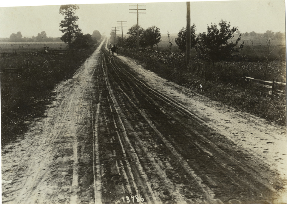 Distant view of horse-drawn carriage traveling on rural road, part of the 1906 Vanderbilt Cup race course on Long Island, New York. Handwritten on back: "Race courses--Vanderbilt Cup, 1906."