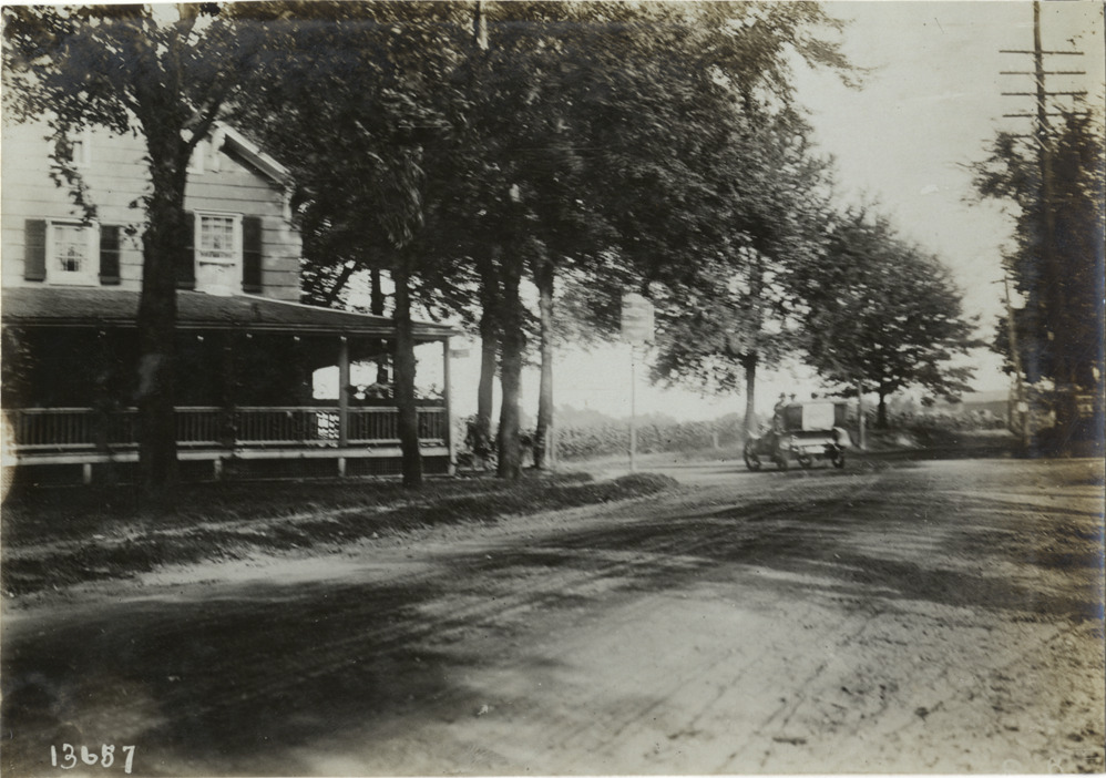 Rear view of motorists in car traveling on dirt road past wooden-frame house, part of the 1906 Vanderbilt Cup race course on Long Island, New York. Handwritten on back: "Race courses--Vanderbilt Cup, 1906."