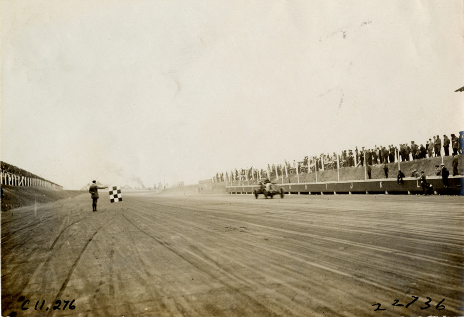 Louis Strang driving Fiat racecar across finish line, Atlanta Speedway