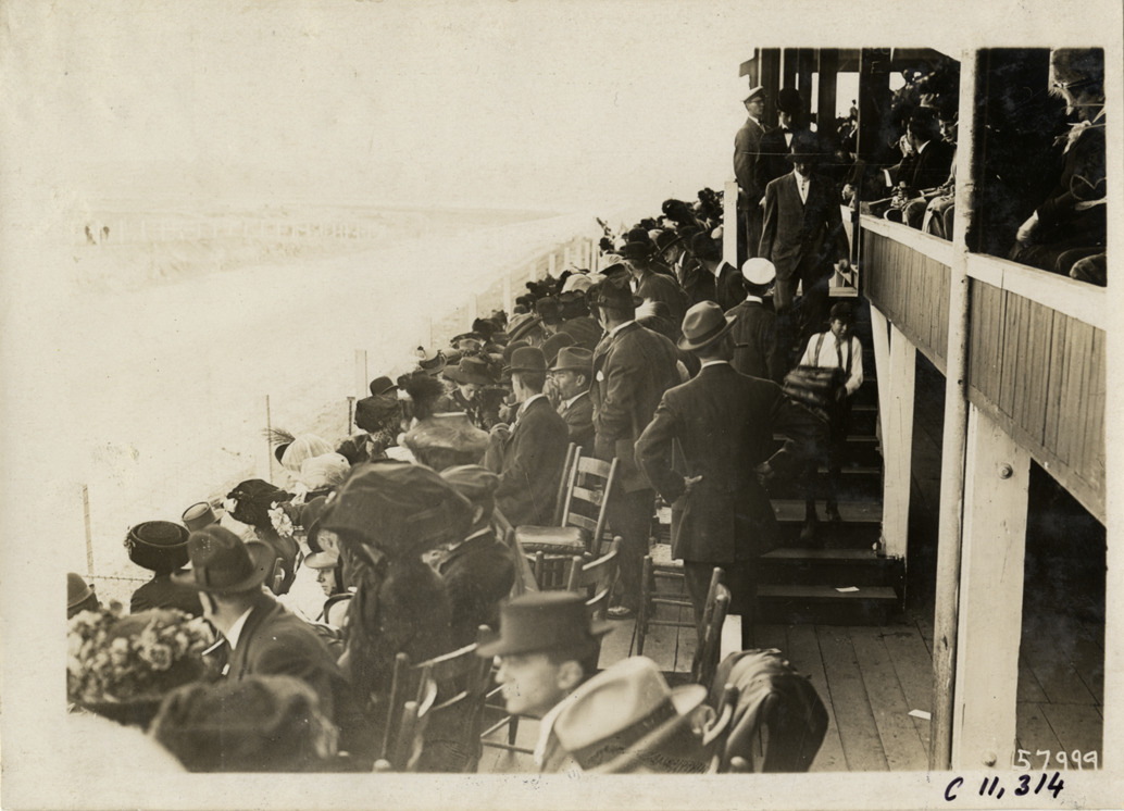 View of spectators in bleachers or grandstand during automobile race at Atlanta Speedway in Georgia. Stamped on back: "Spooner & Wells, Inc., photographers, telephones 3472-3473 Columbus, 1931 Broadway, New York." Handwritten on back: "Races and racing--Atlanta Speedway races, 1909."