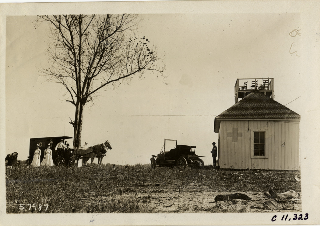 View from horse-drawn ambulance and automobile in front of infirmary building at Atlanta Speedway in Georgia. Two nurses, wearing uniforms, stand in front of ambulance. Stamped on back: "Spooner & Wells, Inc., photographers, telephones 3472-3473 Columbus, 1931 Broadway, New York." Handwritten on back: "Races and racing--Atlanta Speedway races, 1909."
