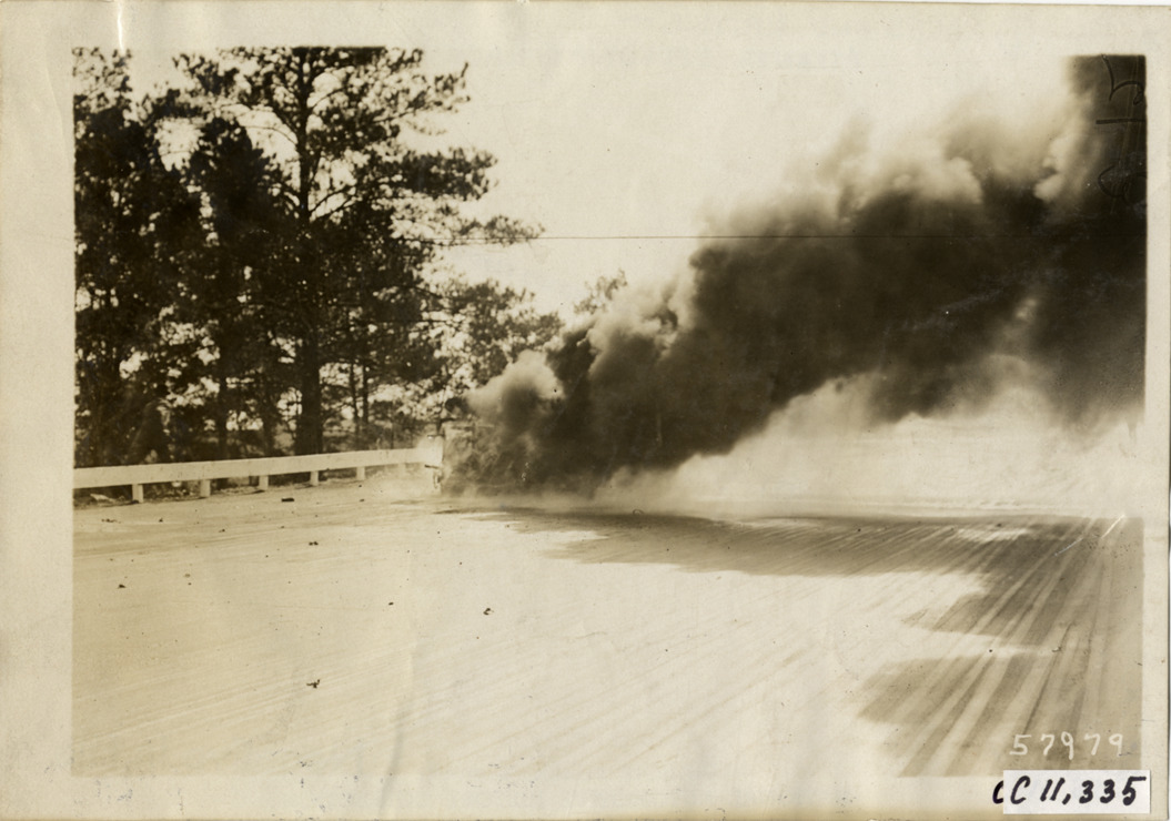View of burning racecar during aftermath of accident at Atlanta Speedway in Georgia. Stamped on back: "Spooner & Wells, Inc., photographers, telephones 3472-3473 Columbus, 1931 Broadway, New York." Handwritten on back: "Races and racing--Atlanta Speedway races, 1909."