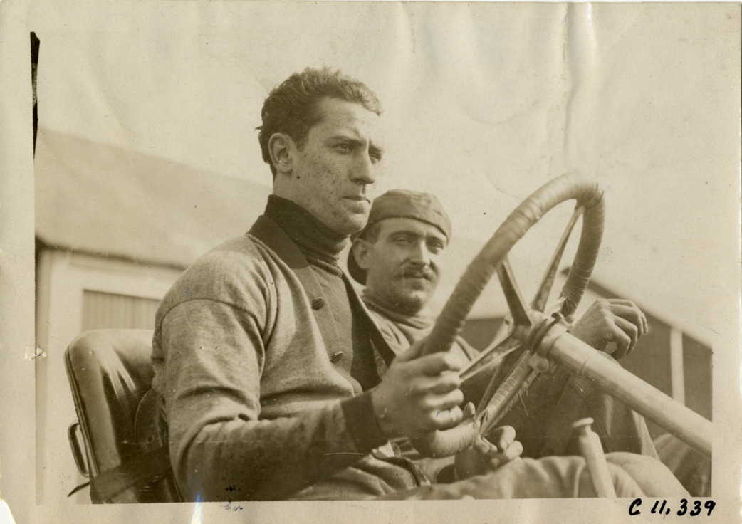 Close-up view of driver and passenger in racecar at Atlanta Speedway in Georgia. Stamped on back: "Spooner & Wells, Inc., photographers, telephones 3472-3473 Columbus, 1931 Broadway, New York." Handwritten on back: "Races and racing--Atlanta Speedway races, 1909."