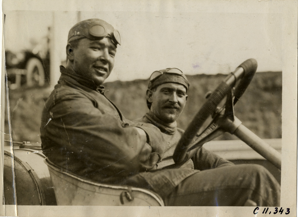 Portrait of driver and passenger in racecar at Atlanta Speedway in Georgia. Stamped on back: "Spooner & Wells, Inc., photographers, telephones 3472-3473 Columbus, 1931 Broadway, New York." Handwritten on back: "Races and racing--Atlanta Speedway races, 1909."