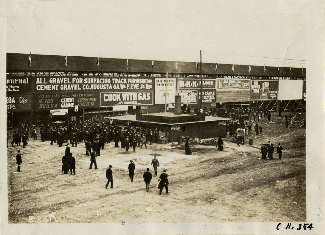 View of spectators gathering near grandstand and refreshment building at Atlanta Speedway in Georgia. Billboards for Cement Stone and Tile Co., Cement Gravel Co. and Jno. Moore & Sons opticians on back of grandstand. "Official souvenirs on sale here" sign on lower level. "Armour's roast beef sandwiches" and "Coca-Cola" signs on refreshment stand or building. Stamped on back: "Spooner & Wells, Inc., photographers, telephones 3472-3473 Columbus, 1931 Broadway, New York." Handwritten on back: "Races and racing--Atlanta Speedway races, 1909."