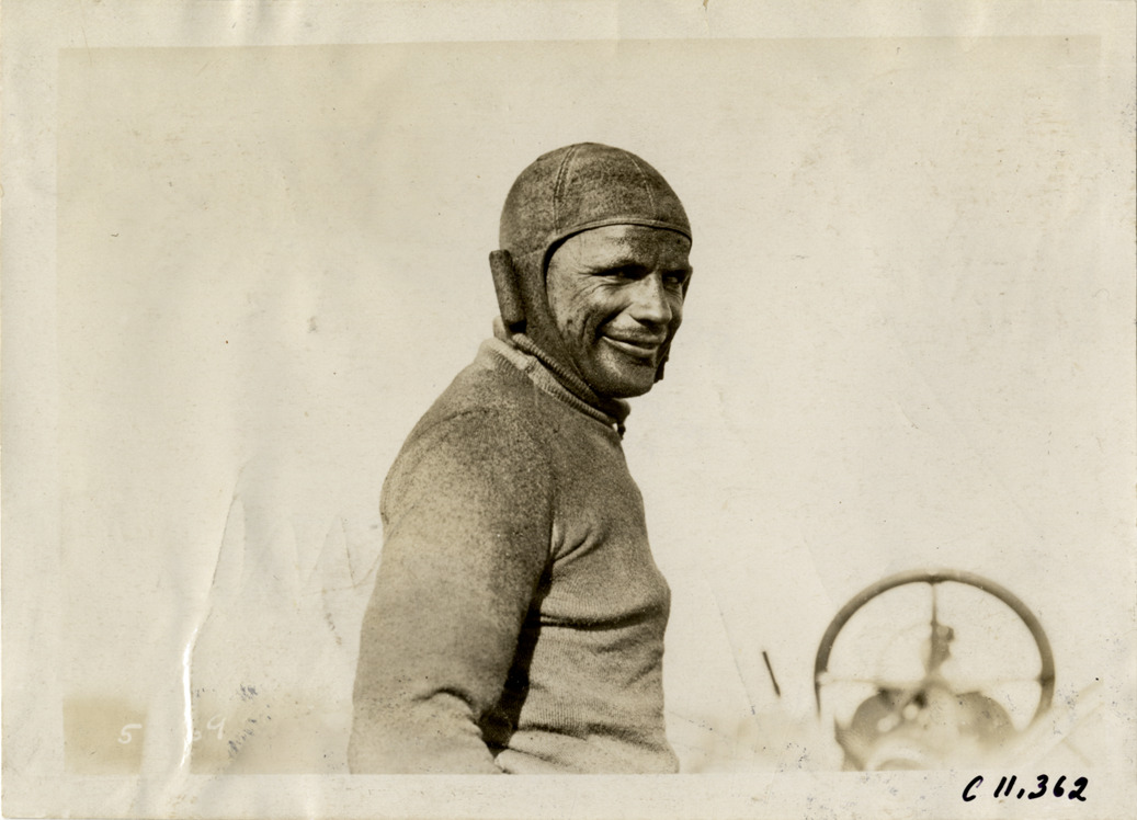 Portrait of racecar driver, wearing helmet, at Atlanta Speedway in Georgia. Stamped on back: "Spooner & Wells, Inc., photographers, telephones 3472-3473 Columbus, 1931 Broadway, New York." Handwritten on back: "Races and racing--Atlanta Speedway races, 1909."