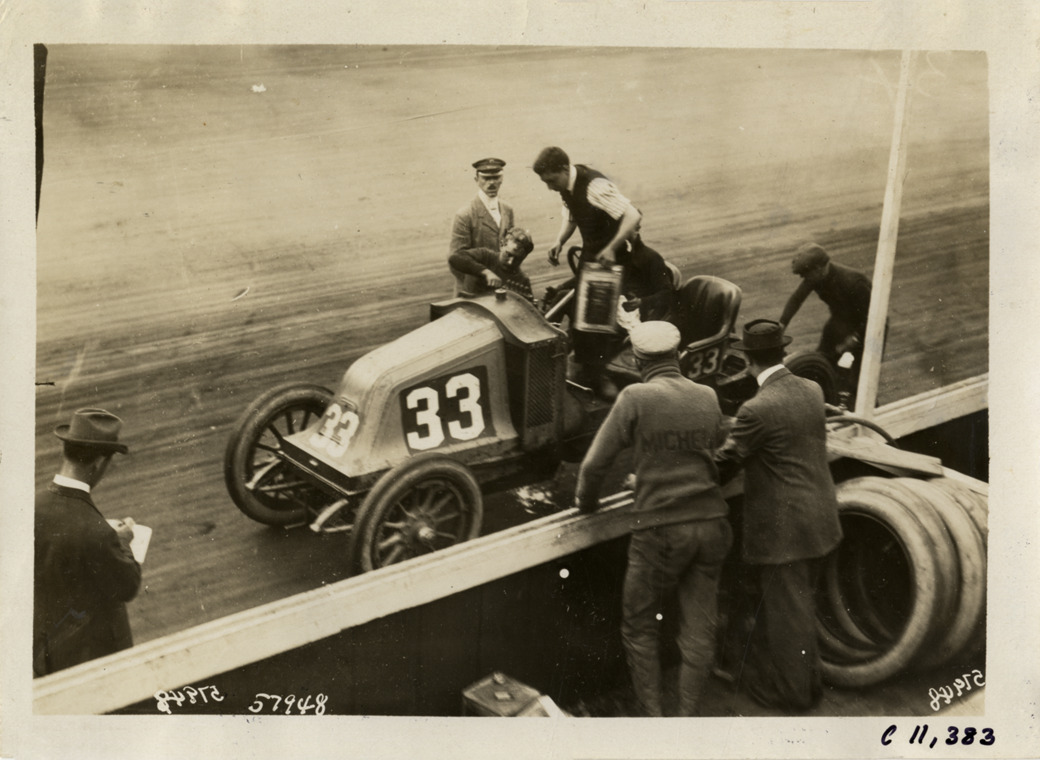 View of pit crew working on racecar no. 33 at Atlanta Speedway in Georgia. Man leaning over pit railing wears "Michelin" jersey. Stamped on back: "Spooner & Wells, Inc., photographers, telephones 3472-3473 Columbus, 1931 Broadway, New York." Handwritten on back: "Races and racing--Atlanta Speedway races, 1909."
