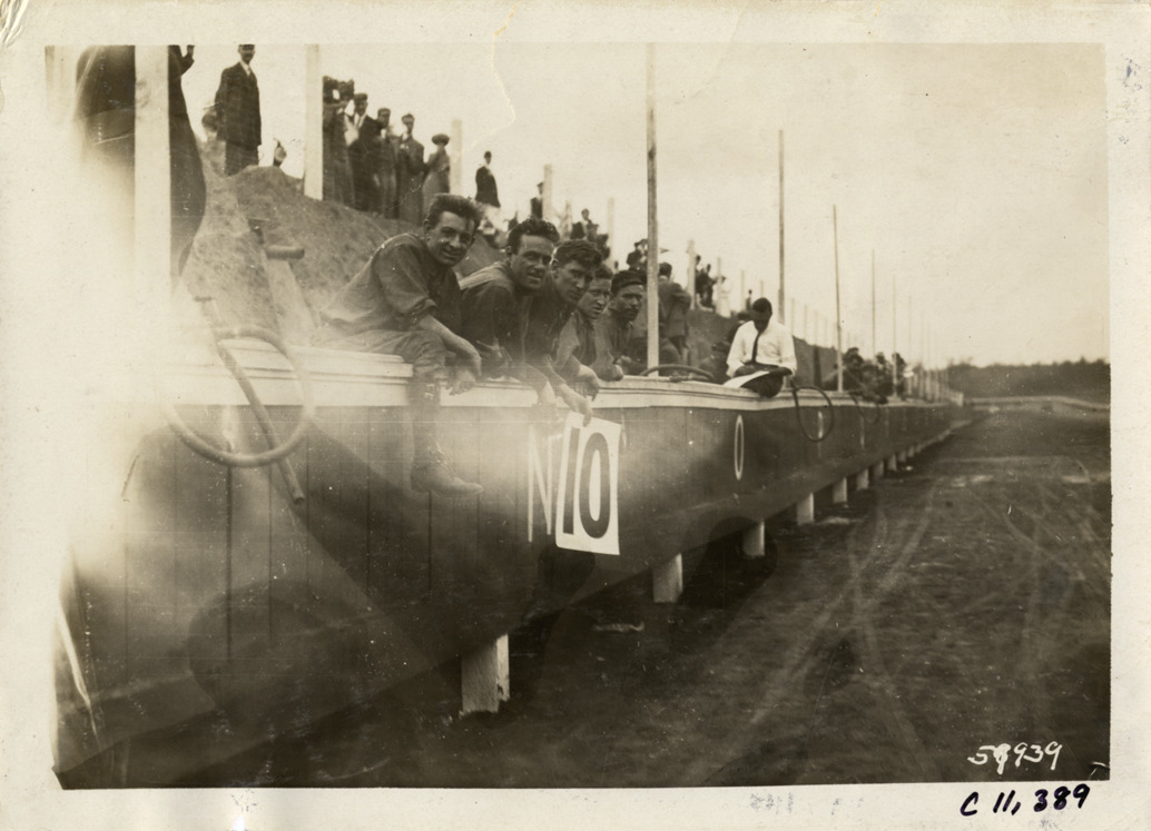 View of several men in pit crew leaning over pit railing at Atlanta Speedway in Georgia. One man holds "10" sign. Stamped on back: "Spooner & Wells, Inc., photographers, telephones 3472-3473 Columbus, 1931 Broadway, New York." Handwritten on back: "Races and racing--Atlanta Speedway races, 1909."