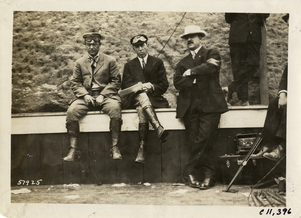 View of racing officials at Atlanta Speedway in Georgia. Two men wear armbands; camera and tripod on ground at right. Stamped on back: "Spooner & Wells, Inc., photographers, telephones 3472-3473 Columbus, 1931 Broadway, New York." Handwritten on back: "Races and racing--Atlanta Speedway races, 1909."