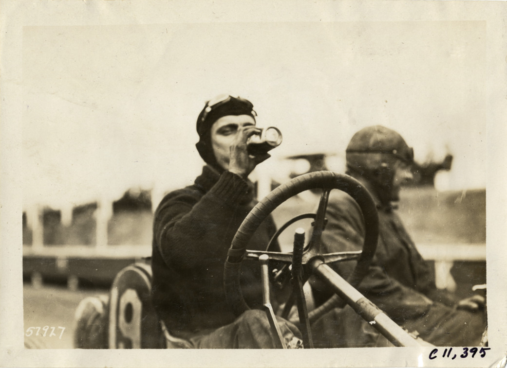 Close-up view of racecar driver, sitting in racecar no. 19, drinking a beverage at Atlanta Speedway in Georgia. Stamped on back: "Spooner & Wells, Inc., photographers, telephones 3472-3473 Columbus, 1931 Broadway, New York." Handwritten on back: "Races and racing--Atlanta Speedway races, 1909."