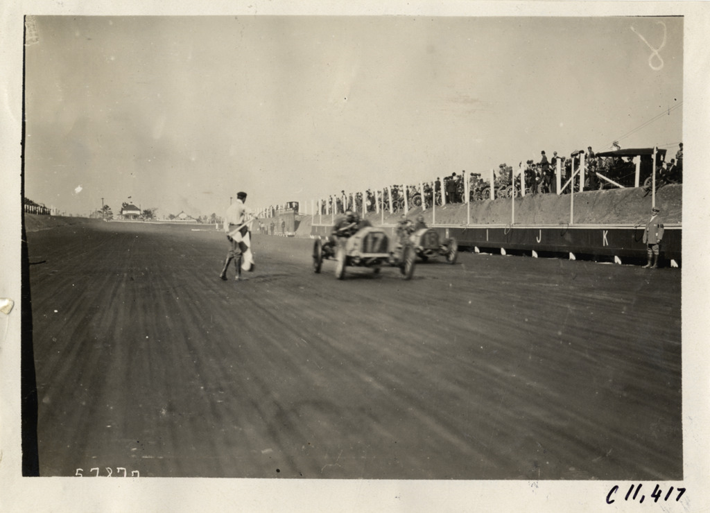 View of racecars no. 17 and no. 18 crossing finish line at Atlanta Speedway in Georgia. Official waves checkered flag. Stamped on back: "Spooner & Wells, Inc., photographers, telephones 3472-3473 Columbus, 1931 Broadway, New York." Handwritten on back: "Races and racing--Atlanta Speedway races, 1909."