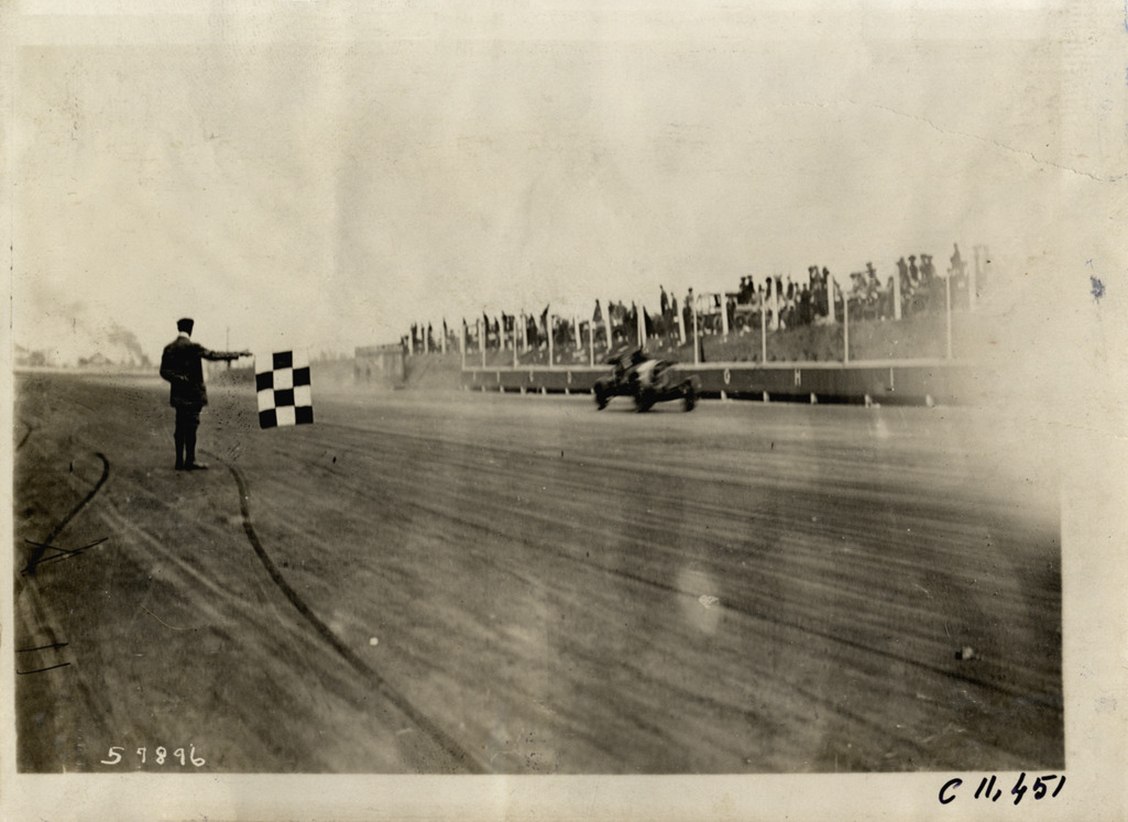 View of racecar crossing finish line at Atlanta Speedway in Georgia. Official waves checkered flag. Stamped on back: "Spooner & Wells, Inc., photographers, telephones 3472-3473 Columbus, 1931 Broadway, New York." Handwritten on back: "Races and racing--Atlanta Speedway races, 1909."