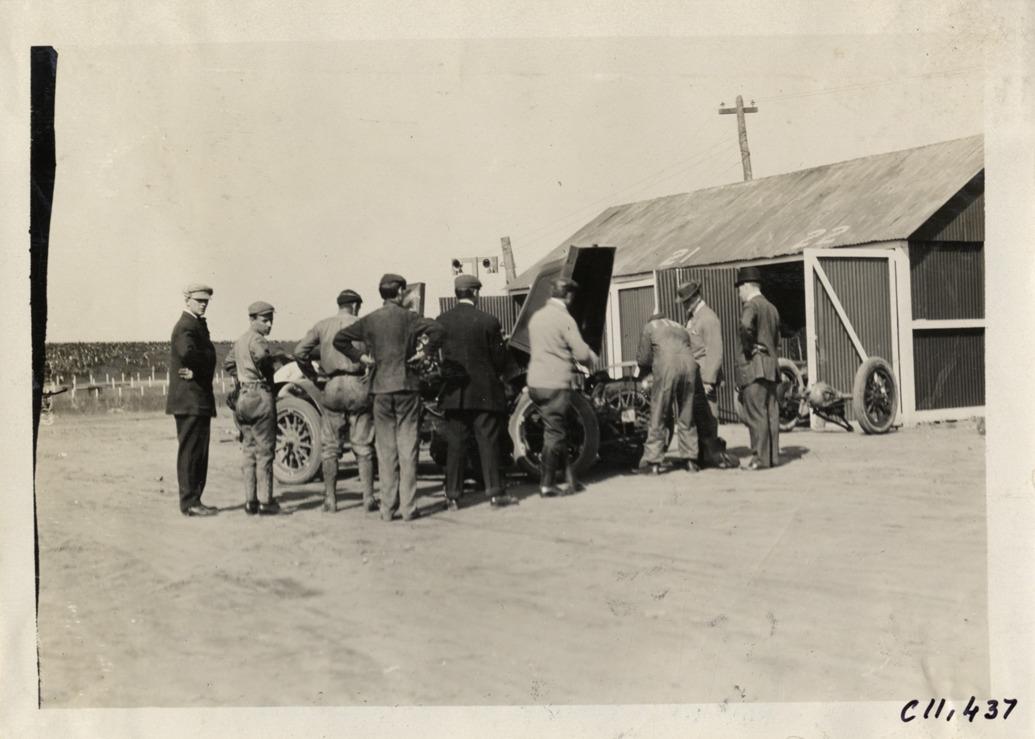 View of group of men standing around racecar at Atlanta Speedway in Georgia. Man wearing "Fiat" coveralls leans over front end of car; wooden-frame garage or shed in background. Stamped on back: "Spooner & Wells, Inc., photographers, telephones 3472-3473 Columbus, 1931 Broadway, New York." Handwritten on back: "Races and racing--Atlanta Speedway races, 1909."