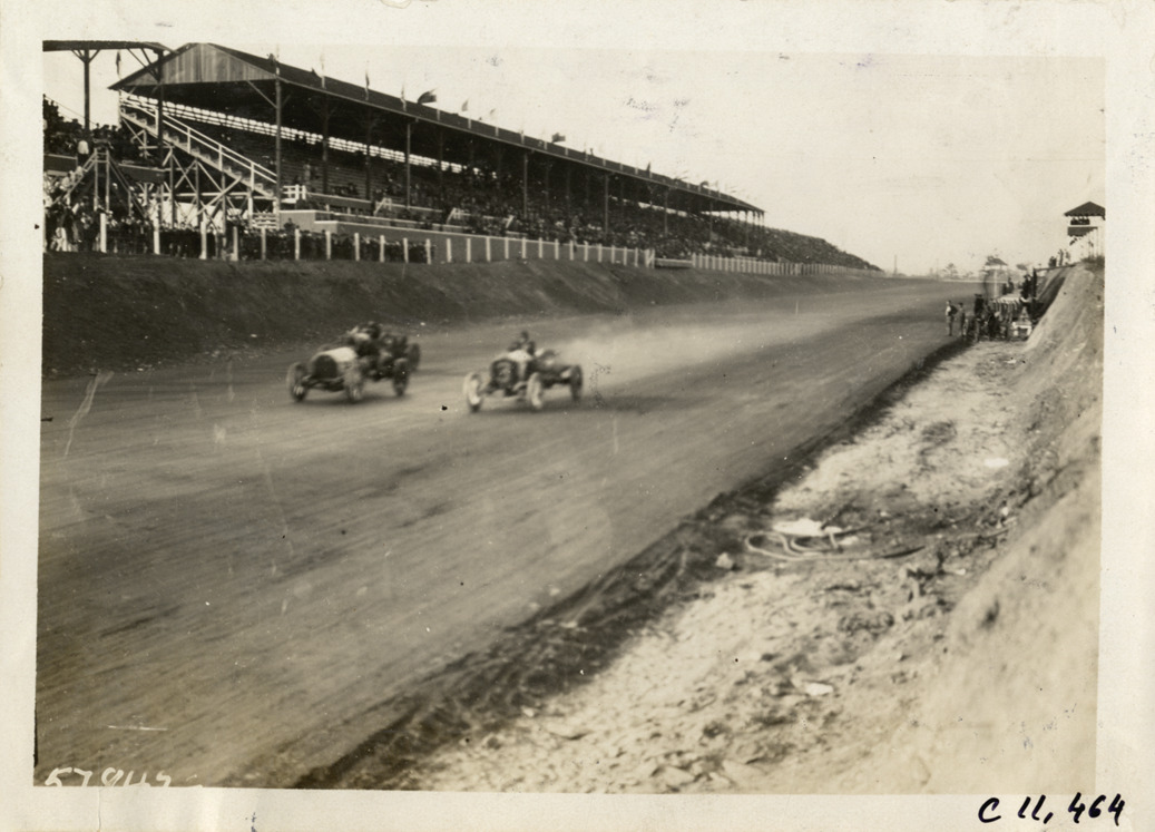View of automobile race at Atlanta Speedway in Georgia. Grandstand in background. Stamped on back: "Spooner & Wells, Inc., photographers, telephones 3472-3473 Columbus, 1931 Broadway, New York." Handwritten on back: "Races and racing--Atlanta Speedway races, 1909. 20 mile stock chassis, 301-350 cu. in. neck & neck race. National & Marmon & Chalmers all the way."