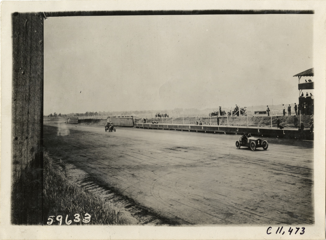 View of automobile race at Atlanta Speedway in Georgia. Racecar no. 1 in foreground. Stamped on back: "Spooner & Wells, Inc., photographers, telephones 3472-3473 Columbus, 1931 Broadway, New York." Handwritten on back: "Races and racing--Atlanta Speedway races, 1910."