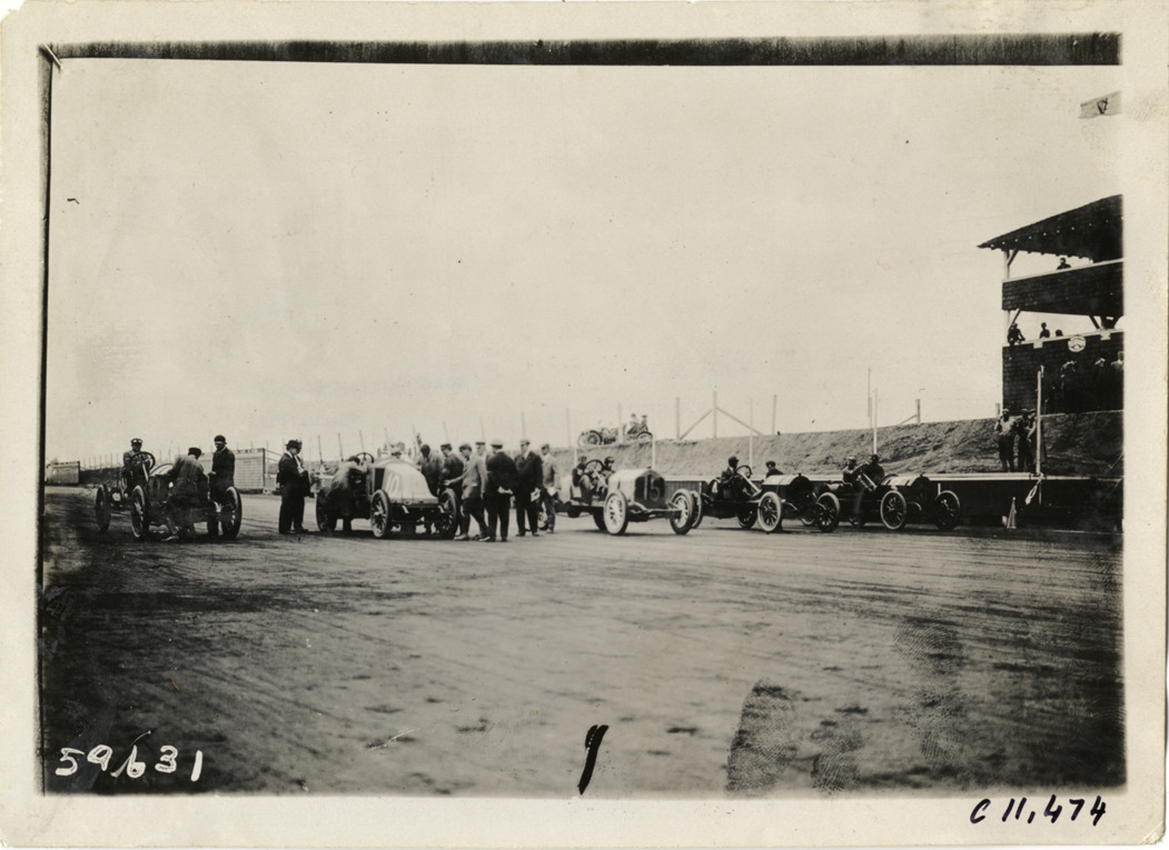 View of men gathering around racecars at starting line at Atlanta Speedway in Georgia. Stamped on back: "Spooner & Wells, Inc., photographers, telephones 3472-3473 Columbus, 1931 Broadway, New York." Handwritten on back: "Races and racing--Atlanta Speedway races, 1910."