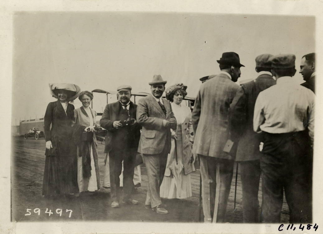 View of group of men and women gathering in front of biplane on racetrack at Atlanta Speedway in Georgia. Stamped on back: "Spooner & Wells, Inc., photographers, telephones 3472-3473 Columbus, 1931 Broadway, New York." Handwritten on back: "Races and racing--Atlanta Speedway races, 1910."