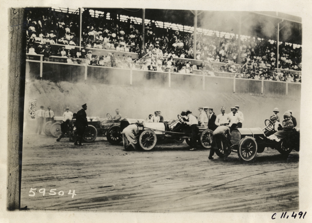 View of men gathering around racecars at starting line at Atlanta Speedway in Georgia. Grandstand in background. Stamped on back: "Spooner & Wells, Inc., photographers, telephones 3472-3473 Columbus, 1931 Broadway, New York." Handwritten on back: "Races and racing--Atlanta Speedway races, 1910."