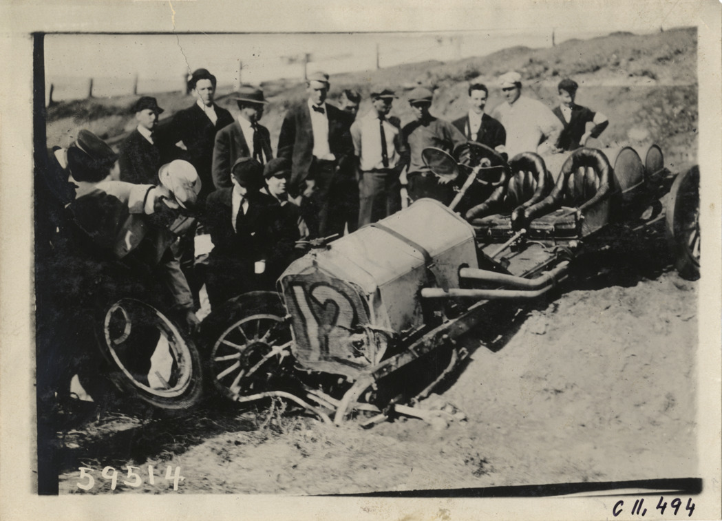 View of spectators standing near damaged car no. 12 during aftermath of accident at Atlanta Speedway in Georgia. Stamped on back: "Spooner & Wells, Inc., photographers, telephones 3472-3473 Columbus, 1931 Broadway, New York." Handwritten on back: "Races and racing--Atlanta Speedway races, 1910."