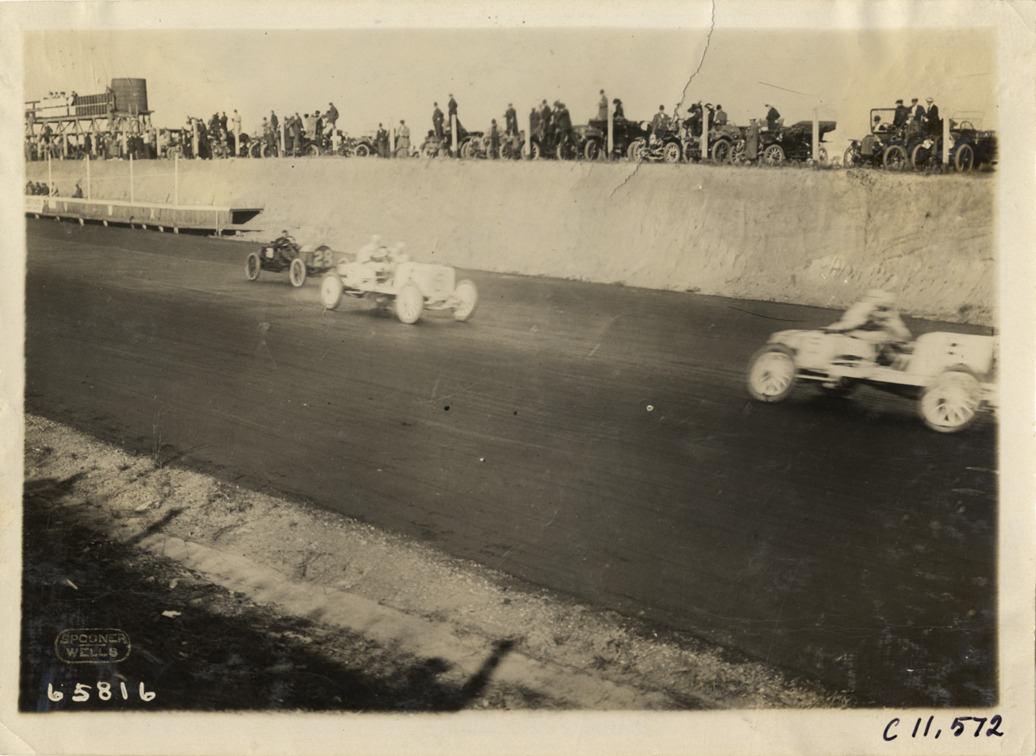 View of automobile race at Atlanta Speedway in Georgia. Printed on front: "Spooner, Wells." Stamped on back: "Spooner & Wells, Inc., photographers, telephones 3472-3473 Columbus, 1931 Broadway, New York." Handwritten on back: "Races and racing--Atlanta Speedway races, 1910."