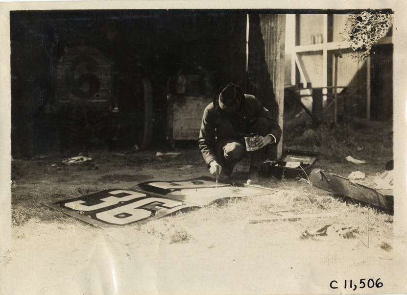 View of man, kneeling on ground, painting "36" sign for racecar at Atlanta Speedway in Georgia. Racecar no. 6 in background. Stamped on back: "Spooner & Wells, Inc., photographers, telephones 3472-3473 Columbus, 1931 Broadway, New York." Handwritten on back: "Races and racing--Atlanta Speedway races, 1909."