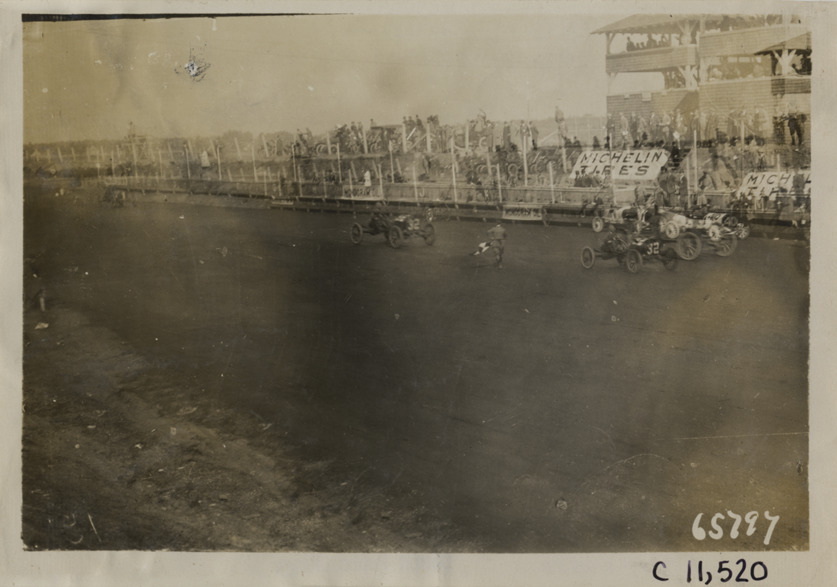 View of racecars crossing finish line during automobile race at Atlanta Speedway in Georgia. Official waves checkered flag; "Michelin tires" banners on sidelines. Stamped on back: "Spooner & Wells, Inc., photographers, telephones 3472-3473 Columbus, 1931 Broadway, New York." Handwritten on back: "Races and racing--Atlanta Speedway races, 1910."