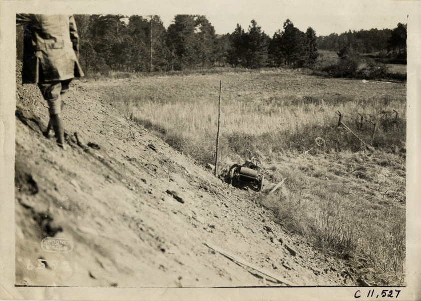 View of damaged racecar at bottom of embankment at Atlanta Speedway in Georgia. Printed on front: "Spooner, Wells." Stamped on back: "Spooner & Wells, Inc., photographers, telephones 3472-3473 Columbus, 1931 Broadway, New York." Handwritten on back: "Races and racing--Atlanta Speedway races, 1910."