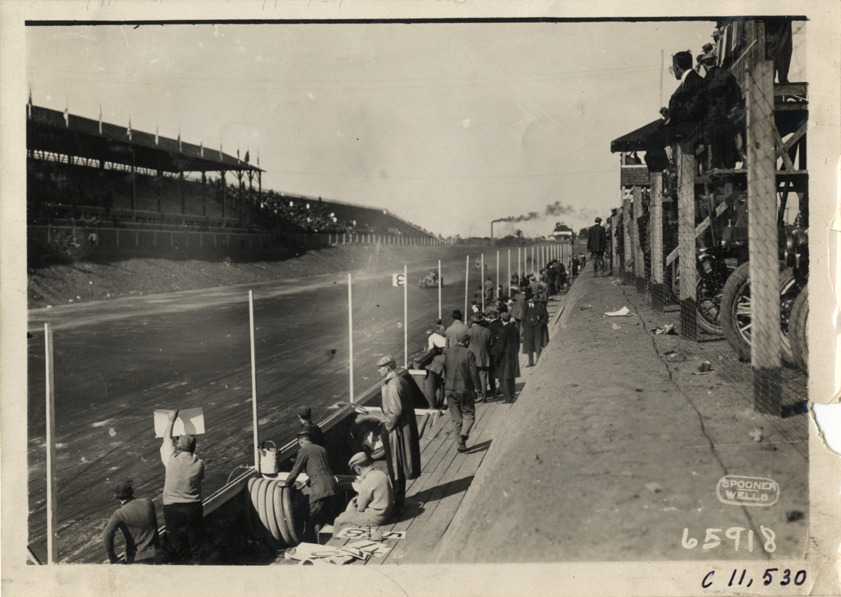 View of automobile race at Atlanta Speedway in Georgia. Pit crews in foreground; grandstand and bleachers in background. Printed on front: "Spooner, Wells." Stamped on back: "Spooner & Wells, Inc., photographers, telephones 3472-3473 Columbus, 1931 Broadway, New York." Handwritten on back: "Races and racing--Atlanta Speedway races, 1910."