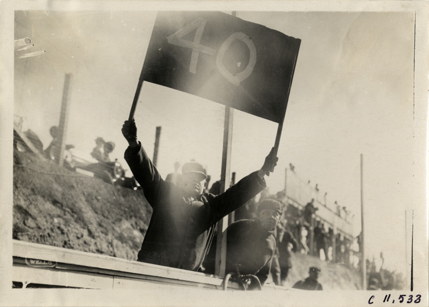 View of man in pit crew holding "40" sign at Atlanta Speedway in Georgia. Printed on front: "Spooner, Wells." Stamped on back: "Spooner & Wells, Inc., photographers, telephones 3472-3473 Columbus, 1931 Broadway, New York." Handwritten on back: "Races and racing--Atlanta Speedway races, 1910."