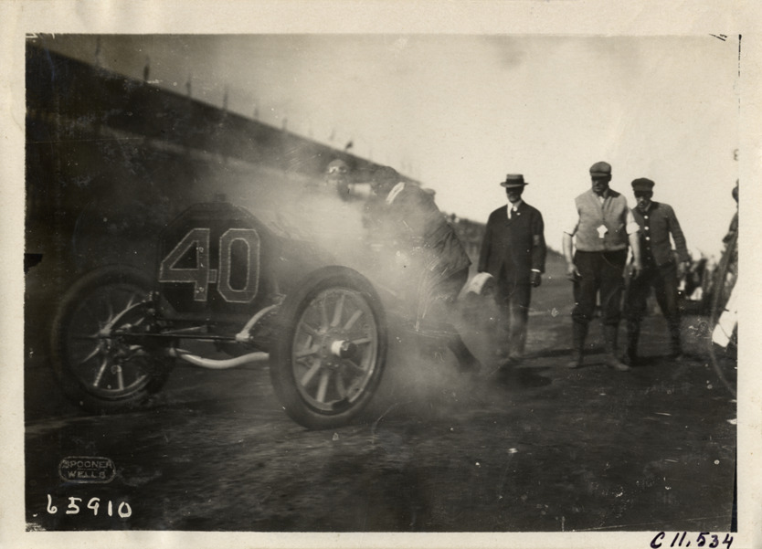 View of two drivers with car no. 40 on side of racetrack at Atlanta Speedway in Georgia. Several men stand nearby. Printed on front: "Spooner, Wells." Stamped on back: "Spooner & Wells, Inc., photographers, telephones 3472-3473 Columbus, 1931 Broadway, New York." Handwritten on back: "Races and racing--Atlanta Speedway races, 1910."