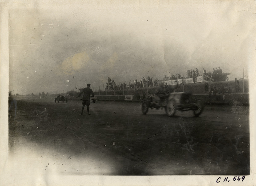 View of racecars crossing finish line during automobile race at Atlanta Speedway in Georgia. Official waves checkered flag; spectators and banners on sidelines. Printed on front: "Spooner, Wells." Stamped on back: "Spooner & Wells, Inc., photographers, telephones 3472-3473 Columbus, 1931 Broadway, New York." Handwritten on back: "Races and racing--Atlanta Speedway races, 1910."