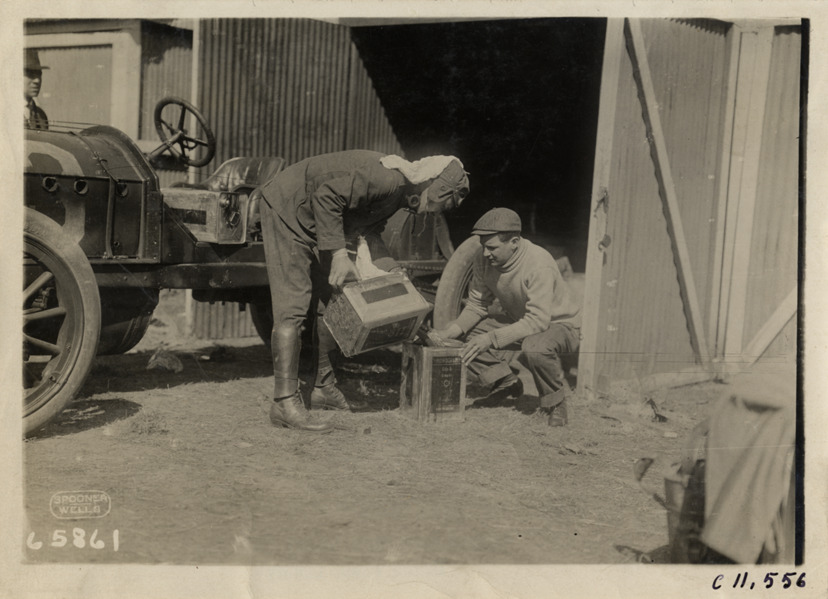 View of two men filling Monogram oil can from second can in front of garage at Atlanta Speedway in Georgia. Racecar in background. Printed on front: "Spooner, Wells." Stamped on back: "Spooner & Wells, Inc., photographers, telephones 3472-3473 Columbus, 1931 Broadway, New York." Handwritten on back: "Races and racing--Atlanta Speedway races, 1910."