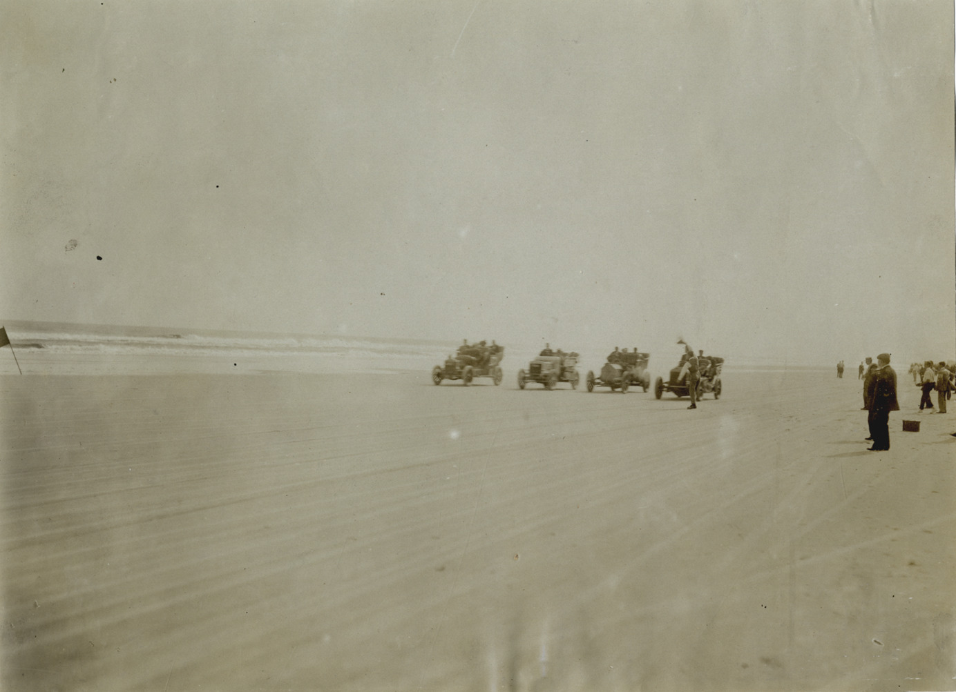 View of racecars at start of Bureau of Information Cup race on beach at Atlantic City, New Jersey. Stamped on back: "Photo by Spooner and Wells, 1536 Broadway, New York. Duplicates any time, any quantities, enlargements any size this plate." Handwritten on back: "Races and racing--Atlantic City, 1906. Start for the Bureau of Information cup, Atlantic City."
