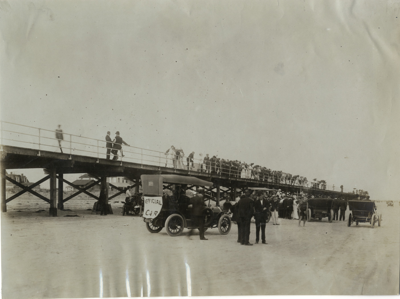 View of racecars parked next to boardwalk before race on beach at Atlantic City, New Jersey. Crowd gathers on boardwalk, looking down at cars. Automobile with "Official car" sign in foreground. Stamped on back: "Photo by Spooner and Wells, 1536 Broadway, New York. Duplicates any time, any quantities, enlargements any size this plate." Handwritten on back: "Races and racing--Atlantic City, 1906. General view at start, Atlantic City."