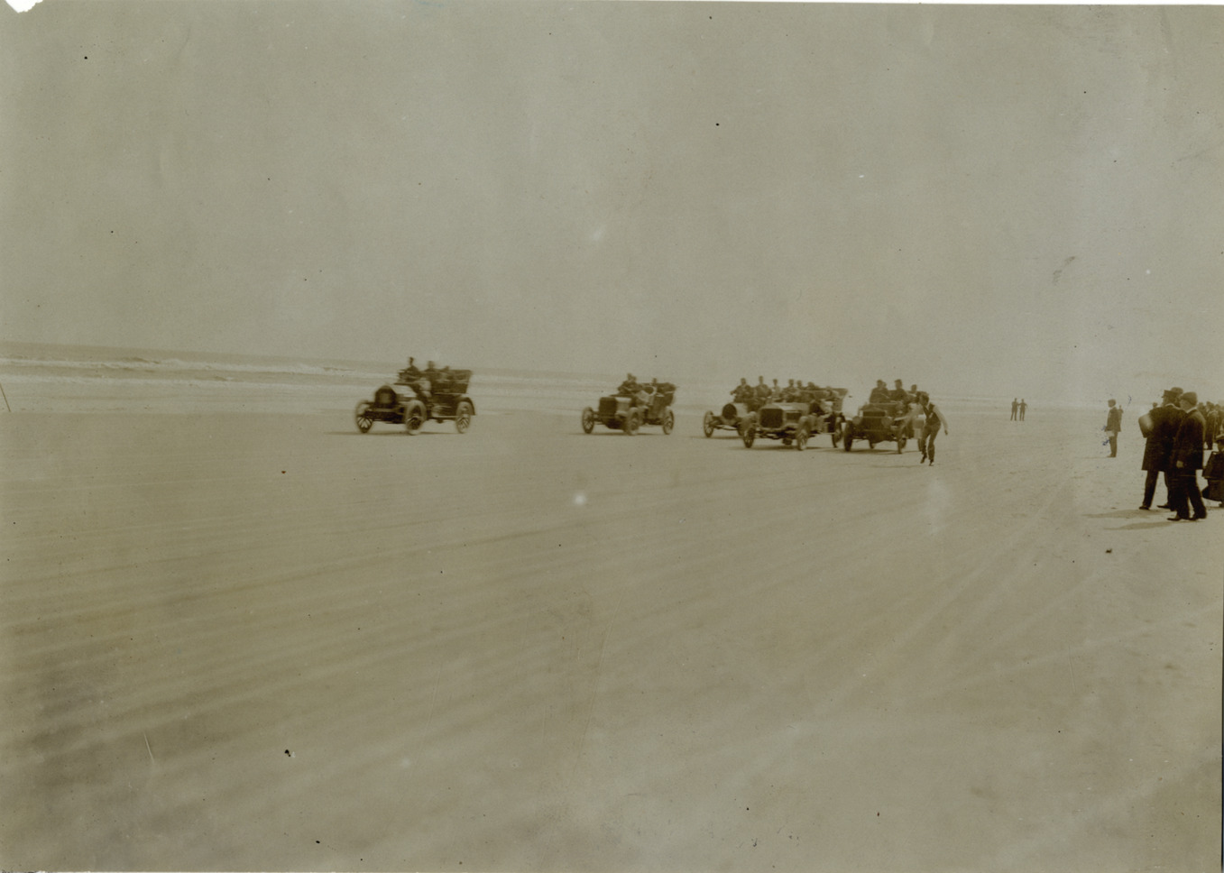 View of racecars at start of Bureau of Information Cup race on beach at Atlantic City, New Jersey. Stamped on back: "Photo by Spooner and Wells, 1536 Broadway, New York. Duplicates any time, any quantities, enlargements any size this plate." Handwritten on back: "Races and racing--Atlantic City, 1906."