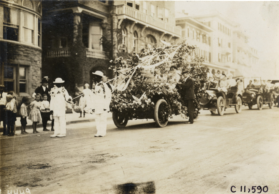 View of car covered in floral decorations for parade at Atlantic City, New Jersey. Spectators stand on sidewalk. Stamped on back: "Photo by N. Lazarnick, 29 West 42nd Street, N.Y., tel. 594 Bryant." Handwritten on back: "Races and racing--Atlantic City, 1907."