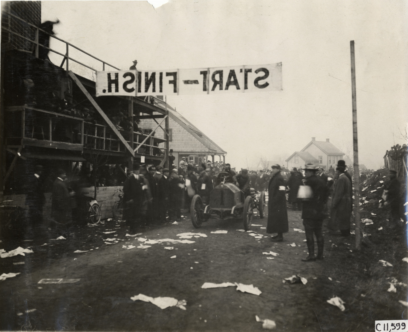 View of Paul Sartori in Bianchi car no. 1 at start-finish line during 1908 Briarcliff Trophy Race in Westchester County, New York. Onlookers watch from sidelines; "Start-finish" banner is suspended over road. Handwritten on back: "#1, 40 h.p. Bianchi, Paul Sartori. Races and racing--Briarcliff Trophy Race, 1908 #1."