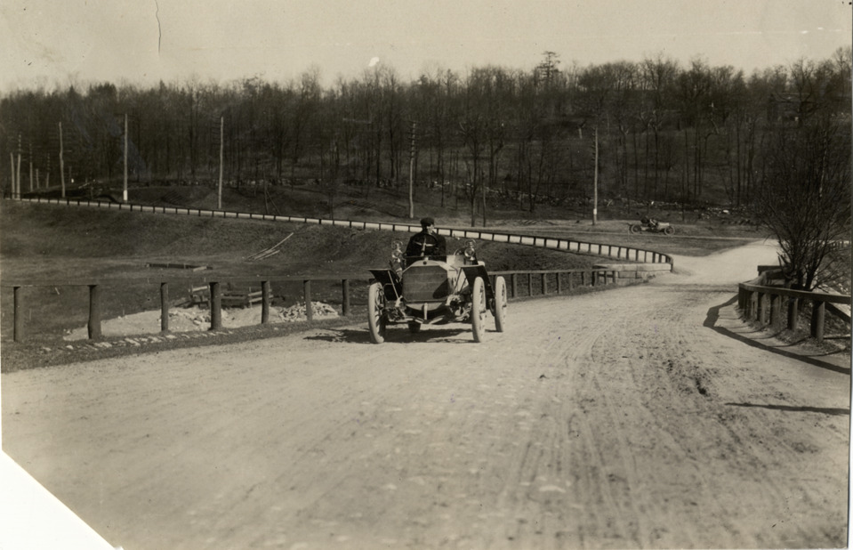 View of driver in car during 1908 Briarcliff Trophy Race in Westchester County, New York. Stamped on back: "Spooner and Wells, 1931 Broadway, New York, duplicates any time, enlargements all sizes, tel. 3472-3473 Col., credit appreciated." Handwritten on back: "Races and racing--Briarcliff Trophy Race, 1908 #1."