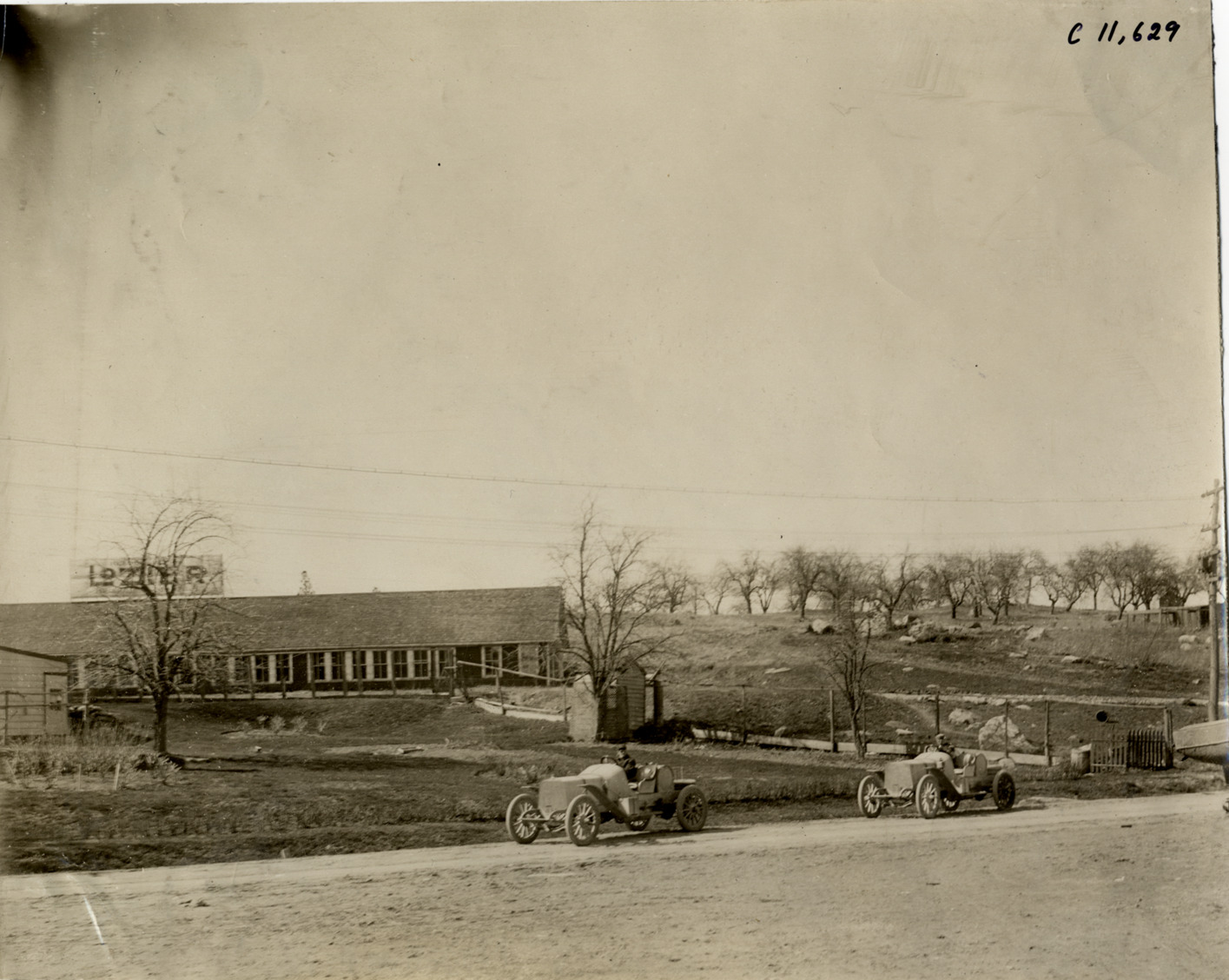View of drivers in two Lozier cars during the 1908 Briarcliff Trophy Race in Westchester County, New York. "Lozier" billboard on building in background. Handwritten on back: "Lozier team. Races and racing--Briarcliff Trophy Race, 1908 #2."