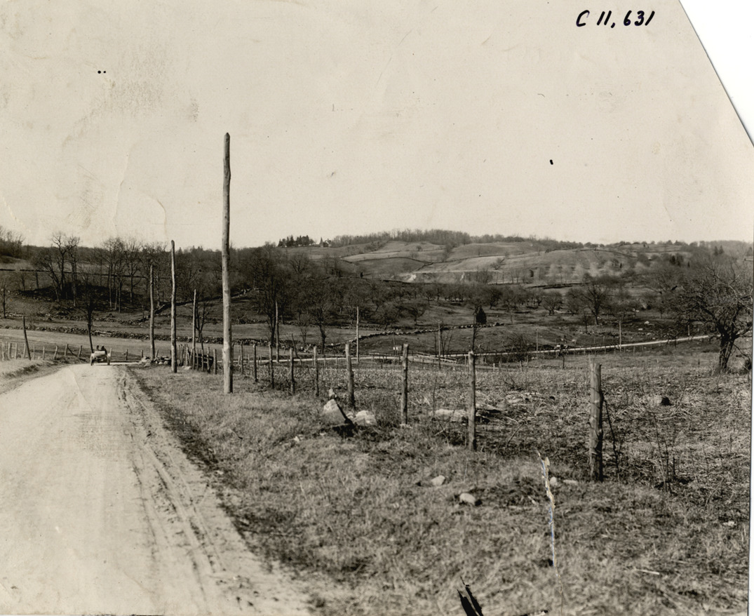 Rear view of car traveling on racecourse during the 1908 Briarcliff Trophy Race in Westchester County, New York. Handwritten on back: "Briarcliff. Races and racing--Briarcliff Trophy Race, 1908 #2."