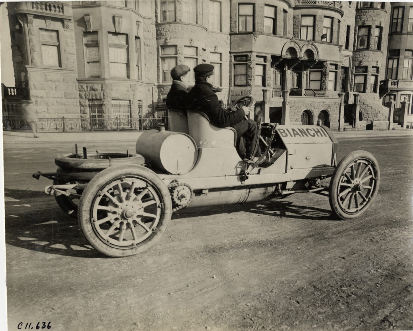 View of Felix Prossen and passenger in Bianchi car no. 1 during 1908 Briarcliff Trophy Race in Westchester County, New York. Stamped on back: "Spooner and Wells, 1931 Broadway, New York, duplicates any time, enlargements all sizes, tel. 3472-3473 Col., credit appreciated." Handwritten on back: "#1, 50 h.p. Bianchi, Felix Prossen. Races and racing--Briarcliff Trophy Race, 1908 #2."