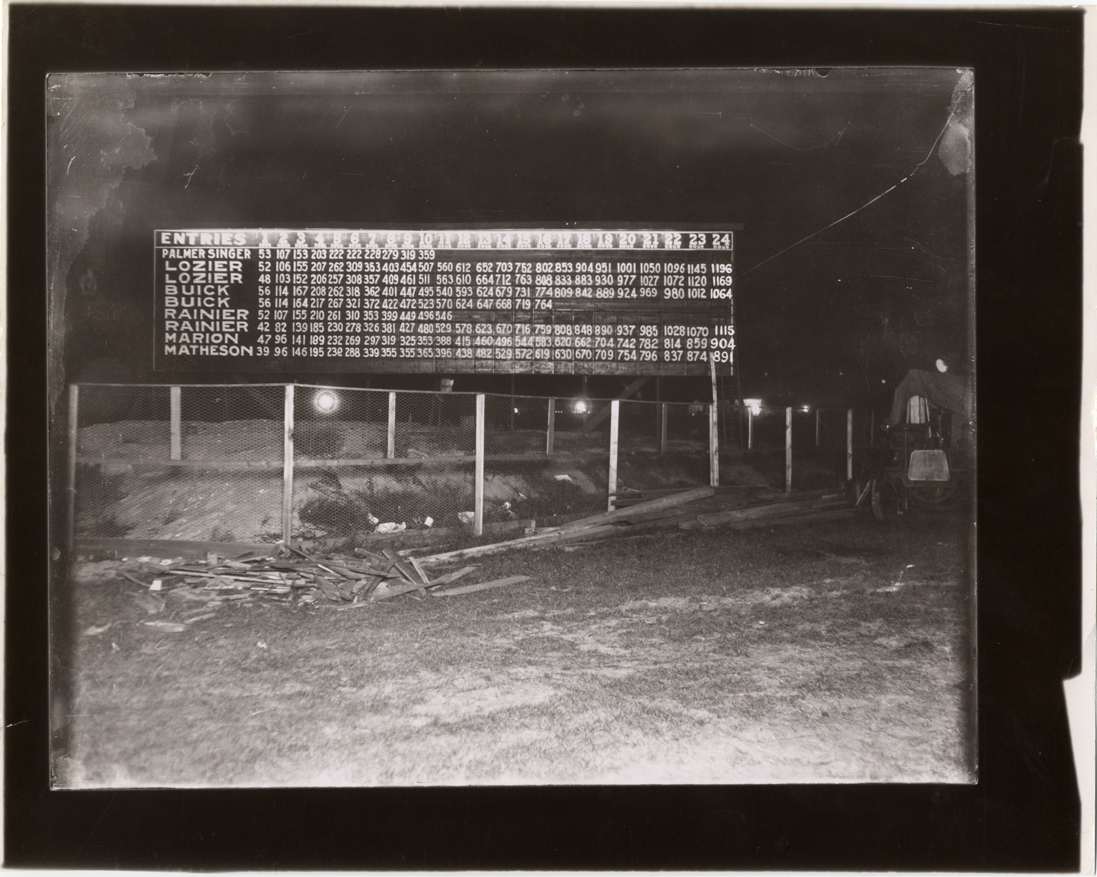 Nighttime view of scoreboard for 24-hour race Brighton Beach race. Palmer-Singer, Lozier, Buick, Rainier, Marion and Matheson cars are listed as entries. Stamped on back: "Photographic illustration by Nick Lazarnick, 230 Park Ave., N.Y." Handwritten on back: "Brighton Beach, N.Y. Races and racing--Brighton Beach."
