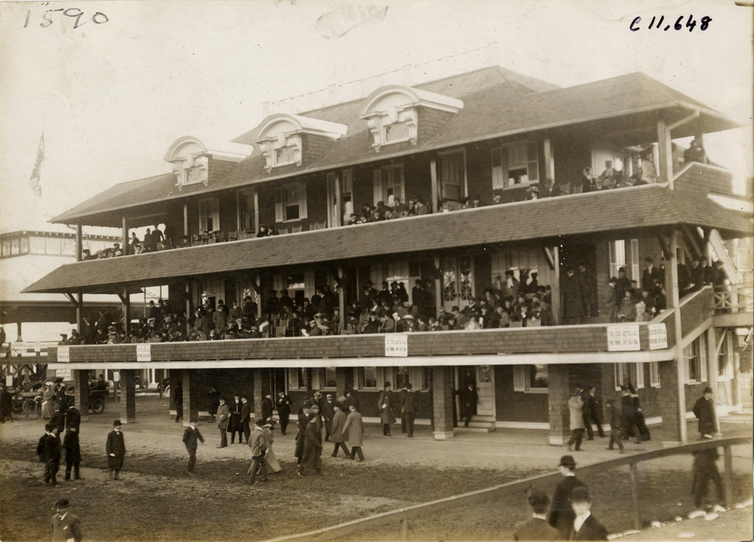 Spectators watching race from clubhouse, 1904 Brighton Beach races