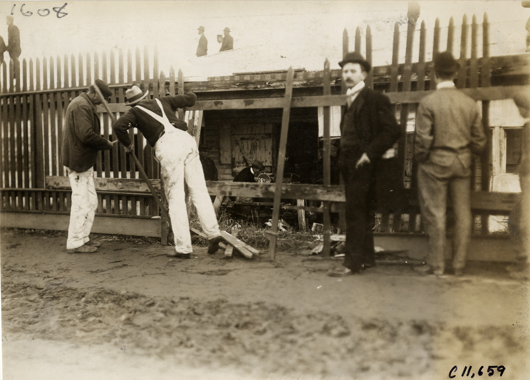 View of men looking through broken fence at crash of Peerless car during 1904 Brighton Beach Races in New York. Handwritten on back: "Wreck of the 24 h.p. Peerless driven by C.G. Wridgway. Repairing fence wrecked by Wridgway machine. Races and racing--Brighton Beach, 1904."