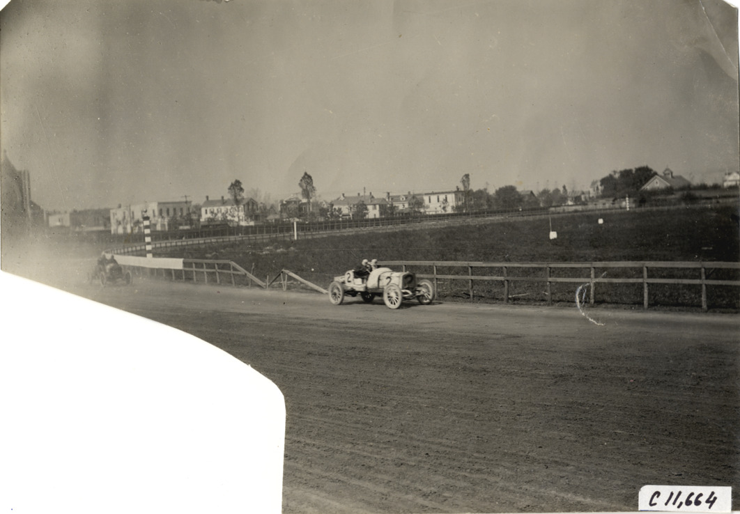 View of two cars racing on track during 1908 Brighton Beach races in New York. Car no. 2 in lead. Stamped on back: "Spooner & Wells, Inc., photographers, telephones 3472-3473 Columbus, 1931 Broadway, New York." Handwritten on back: "Races and racing--Brighton Beach, 1908."