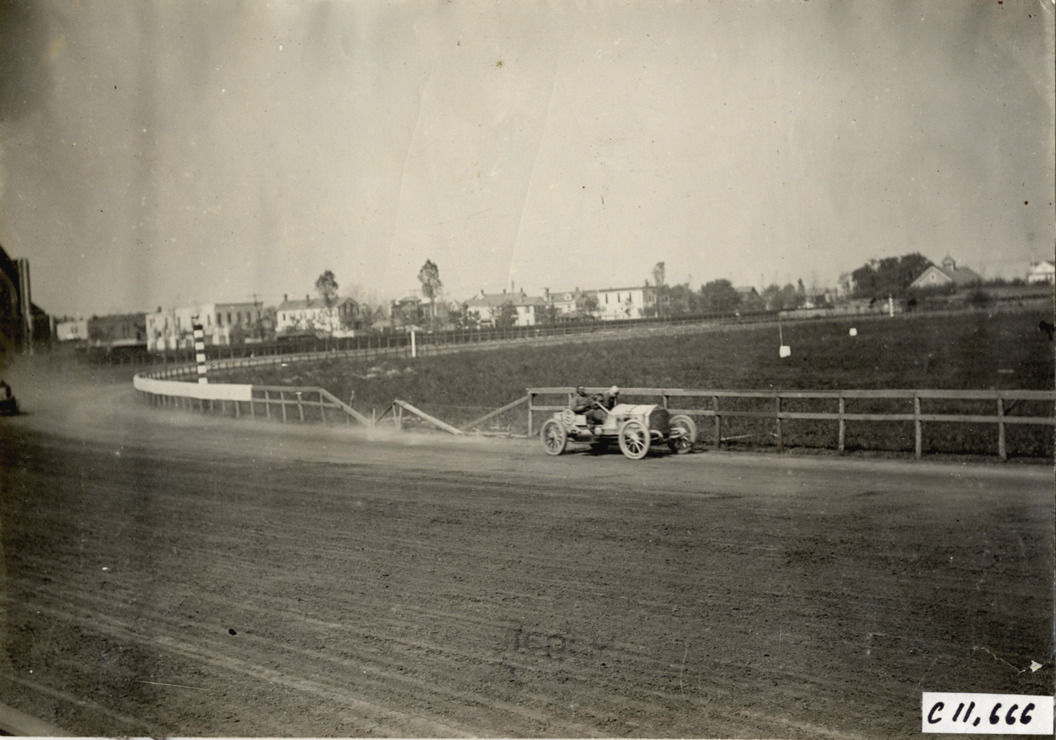 Driver and passenger in racecar, 1908 Brighton Beach races