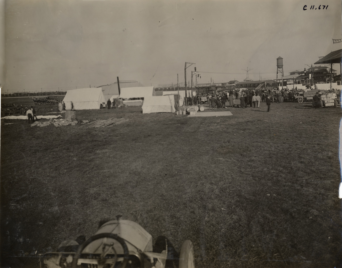 Distant view of crowd, tents and cars on grounds of racetrack during 1908 Brighton Beach races in New York. Stamped on back: "Spooner & Wells, Inc., photographers, telephones 3472-3473 Columbus, 1931 Broadway, New York." Handwritten on back: "Races and racing--Brighton Beach, 1908."