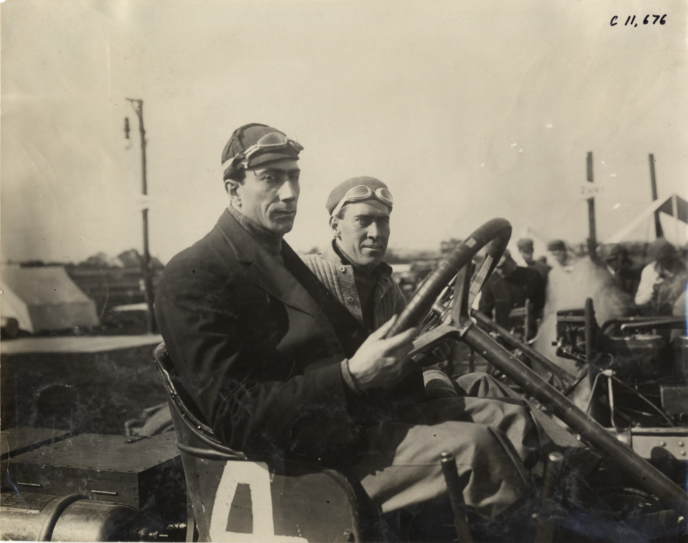 Driver and passenger in racecar, 1908 Brighton Beach races